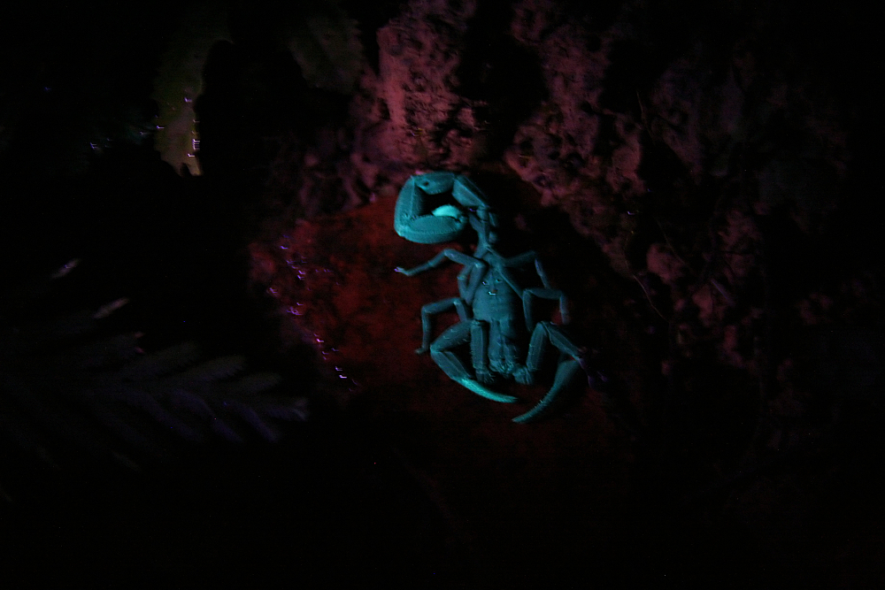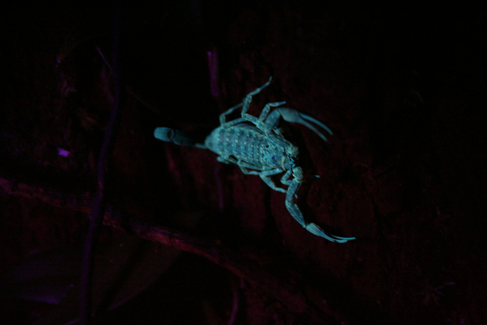 There are around 1500 different species of scorpions (Scorpiones) known on our planet and since I am not a specialist I really don’t know the name of the species I have photographed (maybe you can help me?). Nevertheless, on a night walk through the Adolfo Ducke Forest Reserve near Manaus, Brazil, in September 2010, I have seen an amazing trait of these animals which I never heard of before: scorpions glow when they are exposed to ultraviolet light! The effect is due to fluorescent chemicals in their cuticle and helps very much if you are a zoologist searching for these critters at night! I tried to capture the phenomenon, but since the nature of the process involves a lot of darkness, the photos are a little bit blurred. For comparison I also posted photographs of the same individuals using a normal flash. Do you like it?