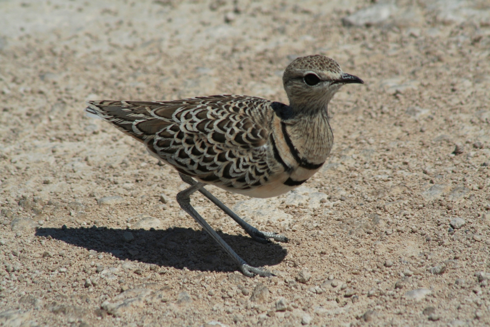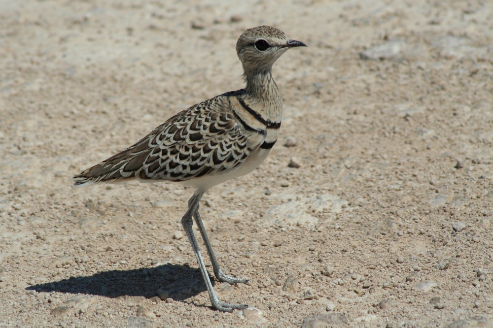 The Double-banded Courser (Rhinoptilus africanus) is a bird species occurring through large areas of sub-Saharan Africa (e.g., Ethiopia, Somalia, Tanzania, South Africa, Namibia). Throughout its range the birds are quite common residents of flat, stony or gravelly, semi-desert terrains with firm, sandy soil and tufty grass or thorny scrubs. In this rather harsh environment the birds live in monogamous pairs breeding on the ground. The dominant food source are insects which are caught with the bill while running around on the ground. Due to its wide occurrence, the species seems not to be endangered as of now.