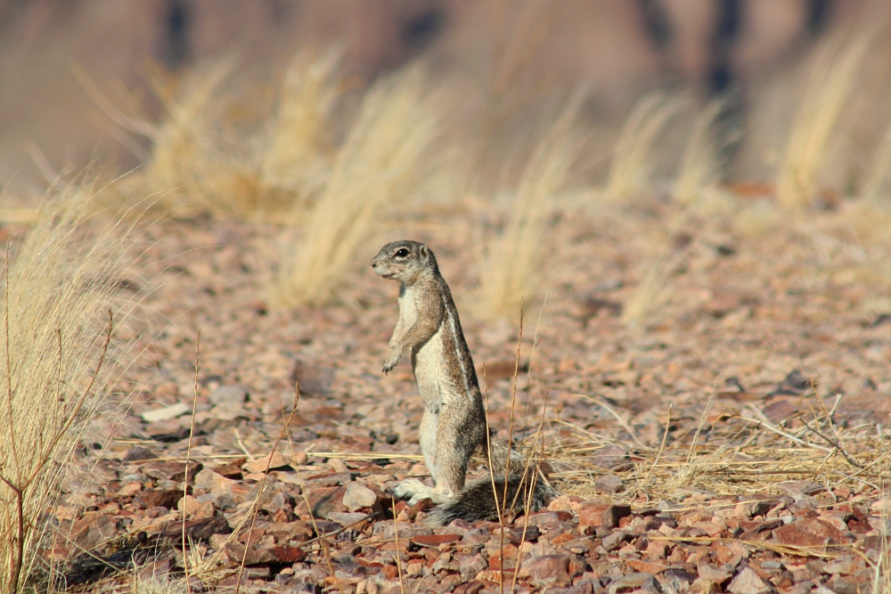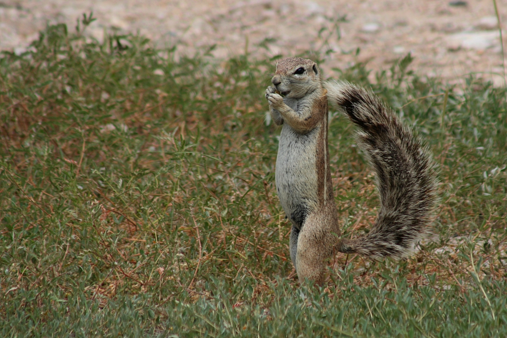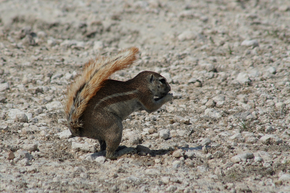 The Cape Ground Squirrel (Xerus inauris) is one of four African ground squirrel species on the continent. The species occurs only in Namibia, South Africa, and Botswana where it inhabits arid to semiarid areas – mainly grasslands with hard ground. The squirrels dig large tunnel systems which can stretch over an area of up to 700 m² with up to 100 entrances. These burrows serve as protection against the scorching heat as well as predators, such as jackals. Nevertheless, since the ground squirrels do not hoard food, much of the daily activity is directed at searching for and eating of insects, fruits, grass, and herbs. Generally, the animals do not have to drink, but get all water from the food they digest. They live in medium-sized groups of either females with their offspring or males – the latter enter the burrows of females only for short amorous adventures. Since the squirrels are diurnal and temperatures on the ground can reach up to 60°C in the open sunlight, they often create their own shade with the help of their bushy tails held above their head – a really clever design! I have photographed these interesting animals in Namibia in February 2007.