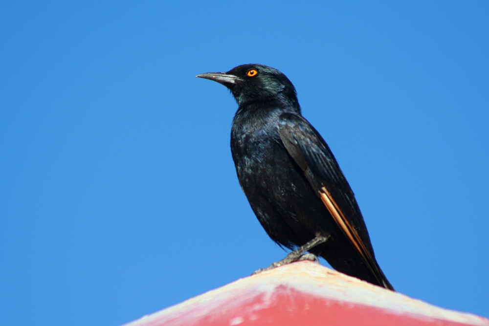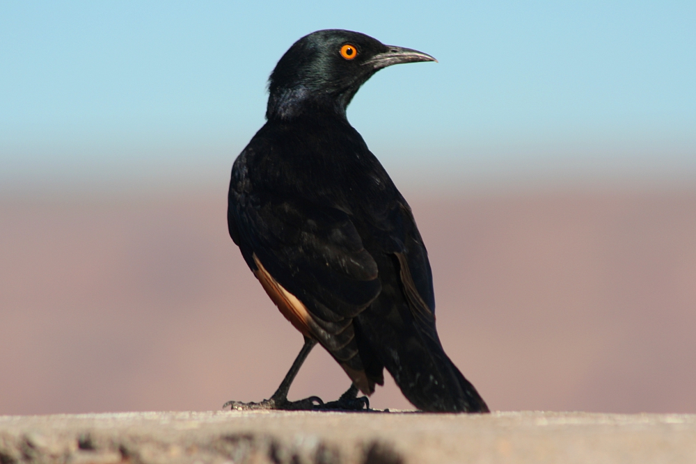 The Pale-winged Starling (Onychognathus nabouroup) can be found in Angola, Namibia, Botswana, and South Africa. It might be looked at as a dull and boring bird, but I consider its black shiny coat with the few orange patches on the wings and eyes as rather elegant and beautiful. The birds inhabit arid to semiarid regions, usually around rocky terrains, cliffs, and gorges. In these habitats, the starlings feed on anything between insects and fruits. I took their photographs at one of the viewpoints across the Fish River Canyon in southern Namibia in February 2007.