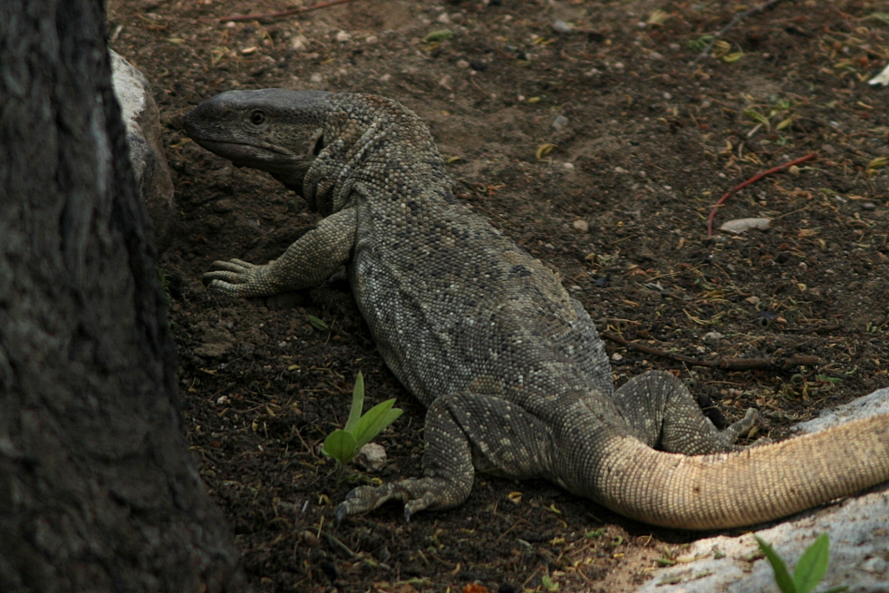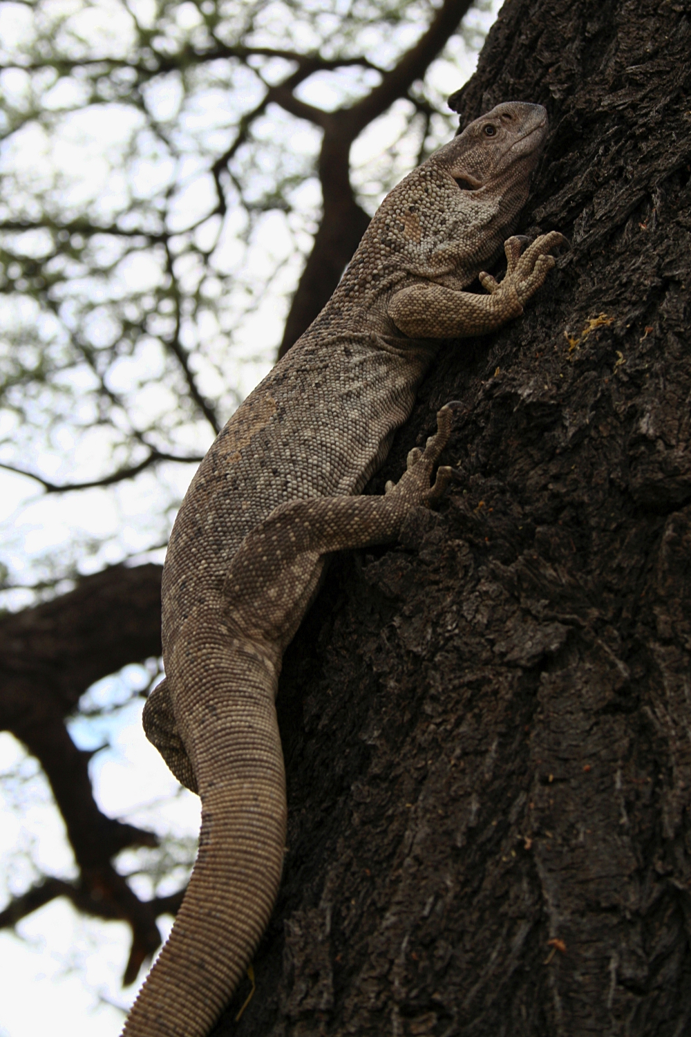 With a length of up to 1.5 m, the Rock Monitor or White-throated Monitor (Varanus albigularis) is the second largest lizard of Africa! It occurs in large parts of the continent – from the Congo, Kenya, and Ethiopia south until the Cape. It is also quite adaptable to different habitats, but mostly seen in dry savannahs. The animals are diurnal covering a distance of up to 5 km each day in search for food. Generally, they hunt on the ground, but they are also proper climbers as the photographs show. The lizards prey mainly on snails and insects, but sometimes also catch cobras, small birds, or even mammals. I have photographed these big reptiles in the Etosha National Park in northern Namibia during a visit in February 2007.