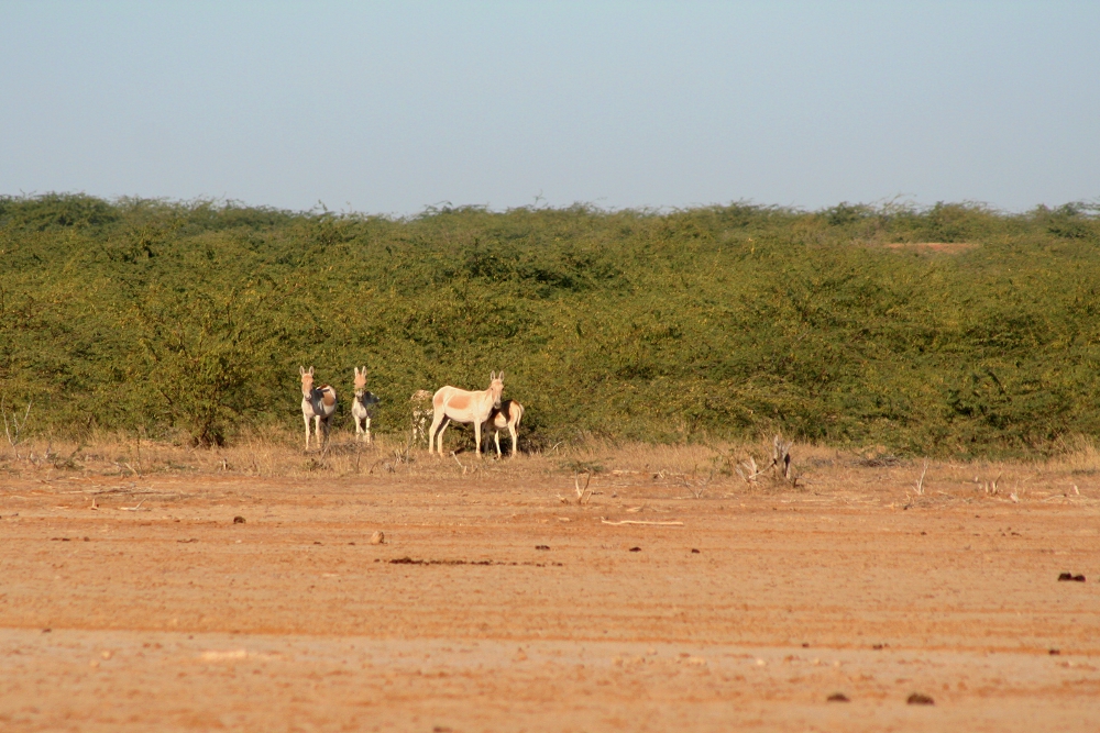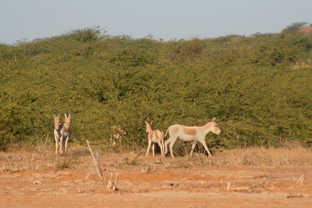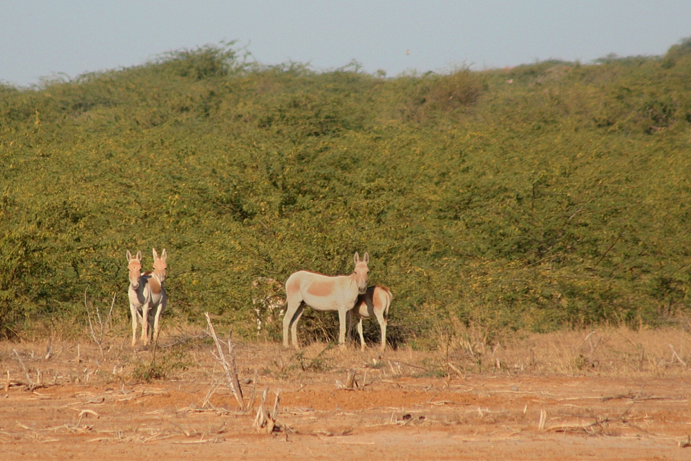 The Indian Wild Ass (Equus hemionus khur), also called the Khur, originally inhabited large parts of southern Asia including western India, Pakistan, Afghanistan, and eastern Iran. However, populations diminished dramatically over the last centuries and came to a minimum in the 1960s when less than 400 of the animals remained in westernmost India. Here in the semi-desert of the Little Rann of Kachchh, the wild asses were kept safe and could recover. Since then numbers rose again to over 4000 and asses were even seen to wander off into neighboring districts. Therefore some optimism is allowed and plans exist to reintroduce the subspecies into the Thar Desert around Jaisalmer, Rajasthan, which also offers a suitable habitat.