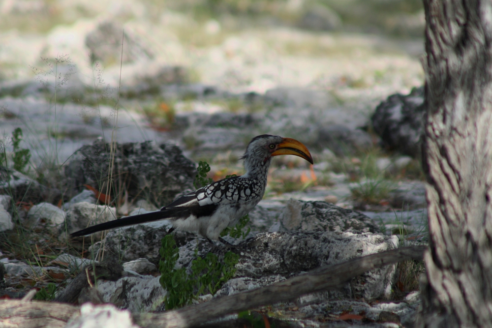 The Southern Yellow-billed Hornbill (Tockus leucomelas) is a medium-sized bird common to the savannahs of southern Africa. Locally known as “flying bananas”, the birds can often be found on the ground foraging for seeds, insects, or scorpions. Their conspicuous yellow bill is the best feature to distinguish the species from their close relatives, the African Grey Hornbill and the Redbilled Hornbill, which also occur in the region. I have photographed these beautiful birds in the Etosha National Park in northern Namibia during a trip in February 2007.
