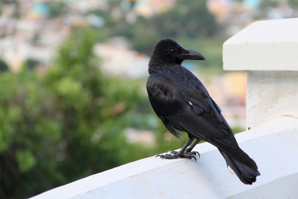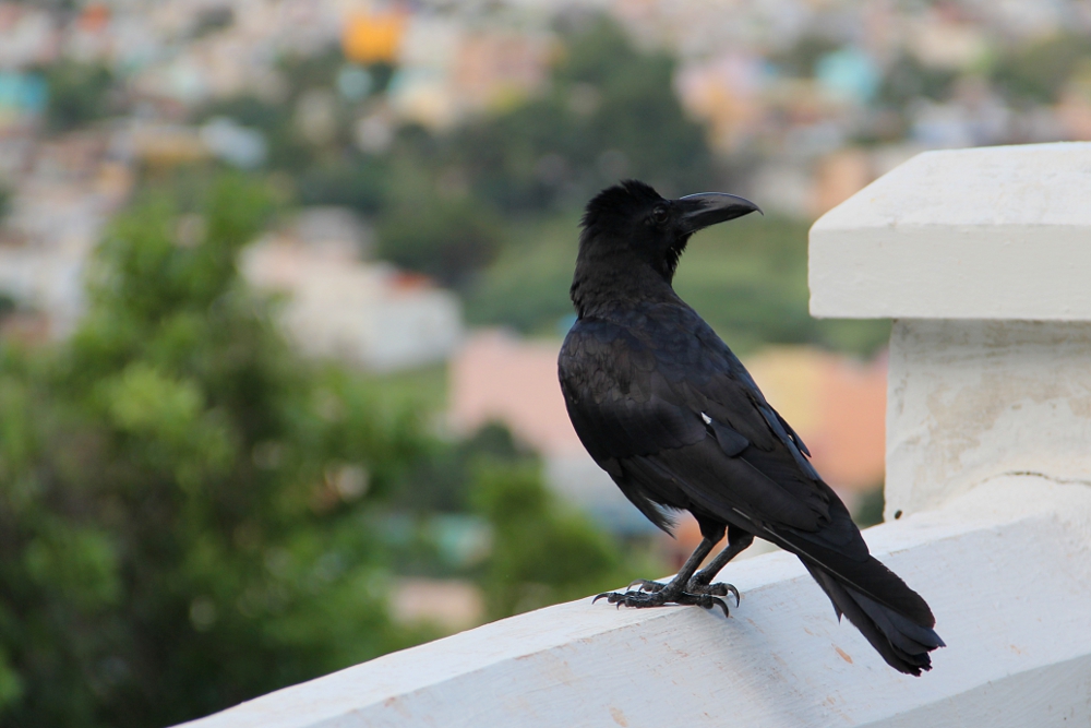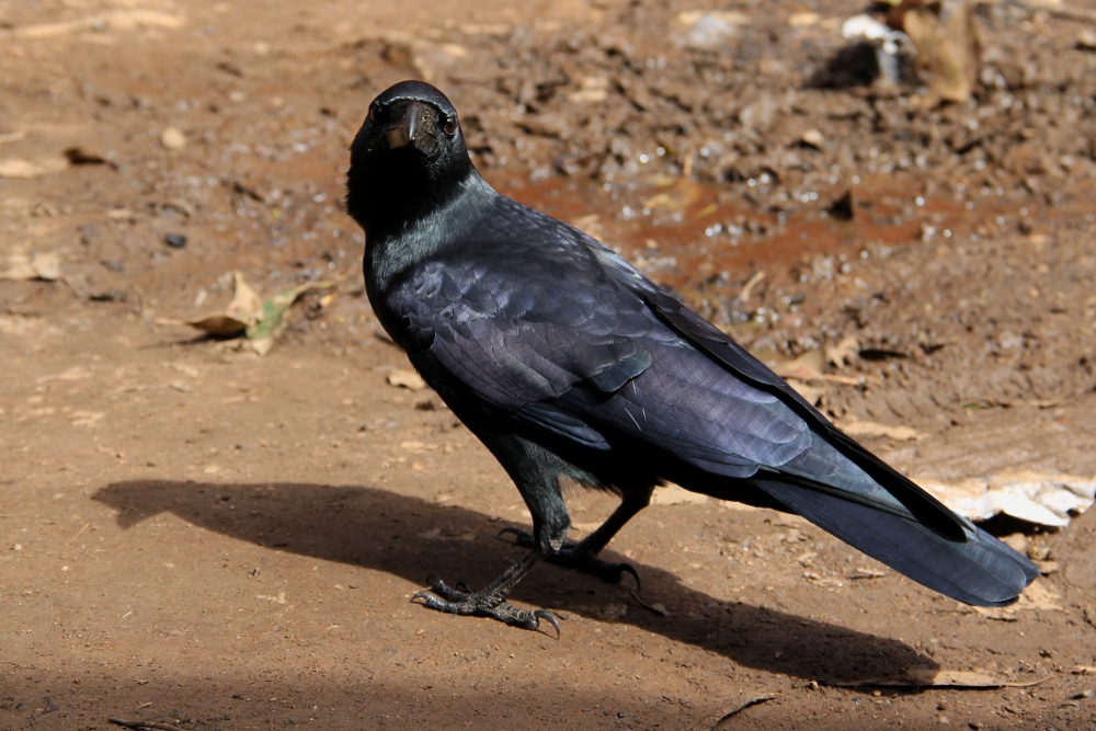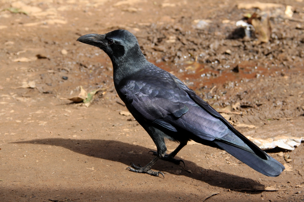 True to its name, the Indian Jungle Crow (Corvus culminatus) occurs throughout India south of the Himalaya. The most characteristic features of these common birds are their thick bill and the glossy black plumage. The opportunists feed on anything between seeds, fruits, insects, and carrion. I have photographed these birds in southern India (Tamil Nadu) during a trip in September 2011.