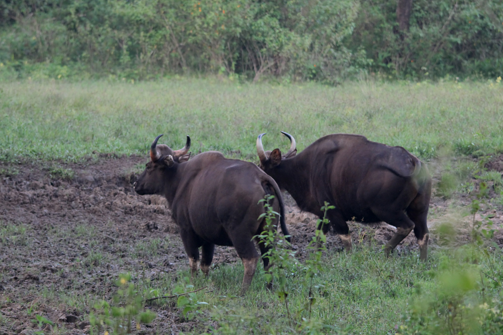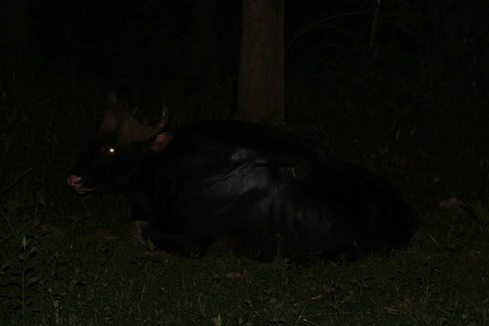 The Gaur (Bos gaurus) or Indian Bison is the largest living bovine and occurs in South and Southeast Asia. Males of this species reach a height of more than 2.2 m and can weigh up to 1.5 t! Thereby, they even surpass the related and similarly impressive American Bison (Bison bison). During the last centuries, the habitats of these beasts disappeared increasingly and nowadays populations are very fragmented. Generally, the animals live in dense forests, but they enter open land for grazing or to approach water bodies. Gaur are naturally diurnal, but in areas populated by humans, they can switch to a nocturnal life in order to prevent encounters with people. The animals live in small groups of several females occasionally accompanied by a single male, but older bulls are often solitary. The species has been domesticated in the border region between India and Myanmar and is then called Gayal (sometimes it is consequently placed in a separate species, Bos frontalis). I have photographed these majestic animals during game drives through the Wayanad Wildlife Sanctuary in Kerala, southern India (September 2011). While most of the animals we saw were females with calves, we also discovered a massive male bull on a night drive. This muscle-bound beast was a really impressive sight and once it got up, it truly towered above our car!