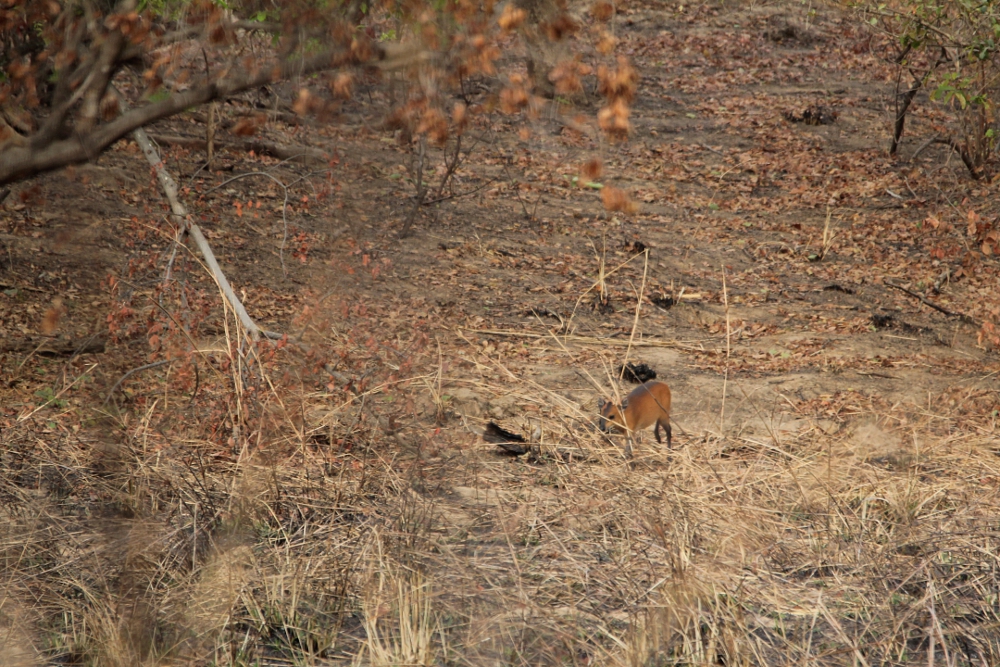The Red-flanked Duiker (Cephalophus rufilatus) is a small antelope species occurring in a belt from Senegal through the Sahel countries up to Uganda. In this region, it inhabits forest relicts and riverine thickets within savannahs. The animals are territorial and usually seen alone or in pairs. Mostly active in the morning and late afternoon, the antelopes feed on fruits, flowers, seeds, and leaves. So far, the species is not threatened by extinction, although it is hunted for its meat and affected by habitat loss. I have observed these shy antelopes in the Pendjari National Park in northern Benin during a journey in February 2012.