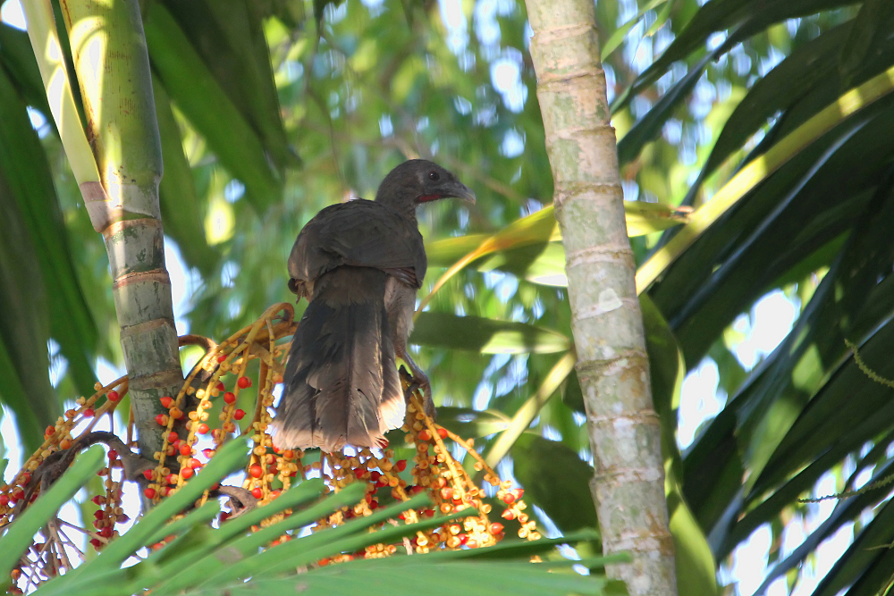 The Grey-headed Chachalaca (Ortalis cinereiceps) occurs from eastern Honduras to northwestern Colombia. Although related to chicken, the large birds are arboreal, climbing in trees and walking along branches in search for fruits and berries. Consequently, they are mostly seen in woodlands, secondary forests, and shrubby areas. Chachalacas are quite social and live in groups of six to twelve individuals. I have seen them in Central Panama in March 2014. Unfortunately, just after I took the photograph above, the bird jumped into cover behind leaves and twigs.