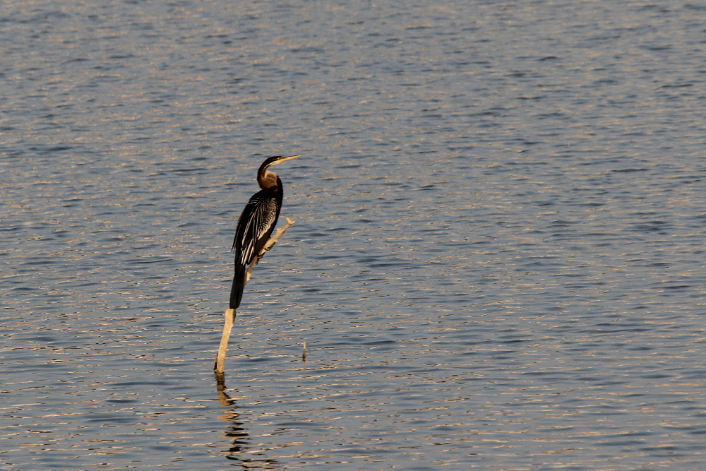 The Oriental Darter (Anhinga melanogaster) is a moderately large water bird occurring in South and Southeast Asia. The birds share many characteristics with cormorants: they prey mostly on fish while swimming in lakes, rivers, or other water bodies. Actually, darters impale fish with their long and sharp bills during dives. After surfacing, they toss the prey into the air and swallow it head-first. They can be differentiated from cormorants by their longer and comparatively slender neck which caused their colloquial name of snakebird. In general, the birds live solitarily and consequently I spotted only one individual during my walk along the Hamirsar Tank in Bhuj, Kachchh, western India, in January 2015.