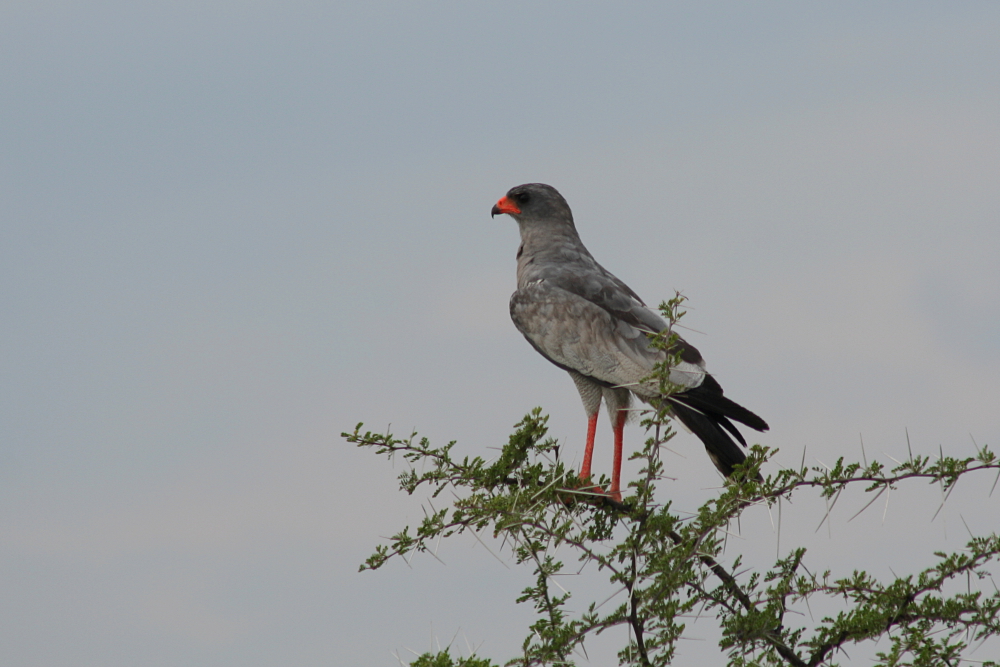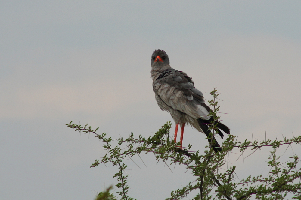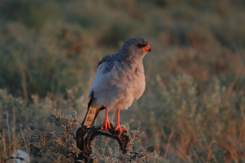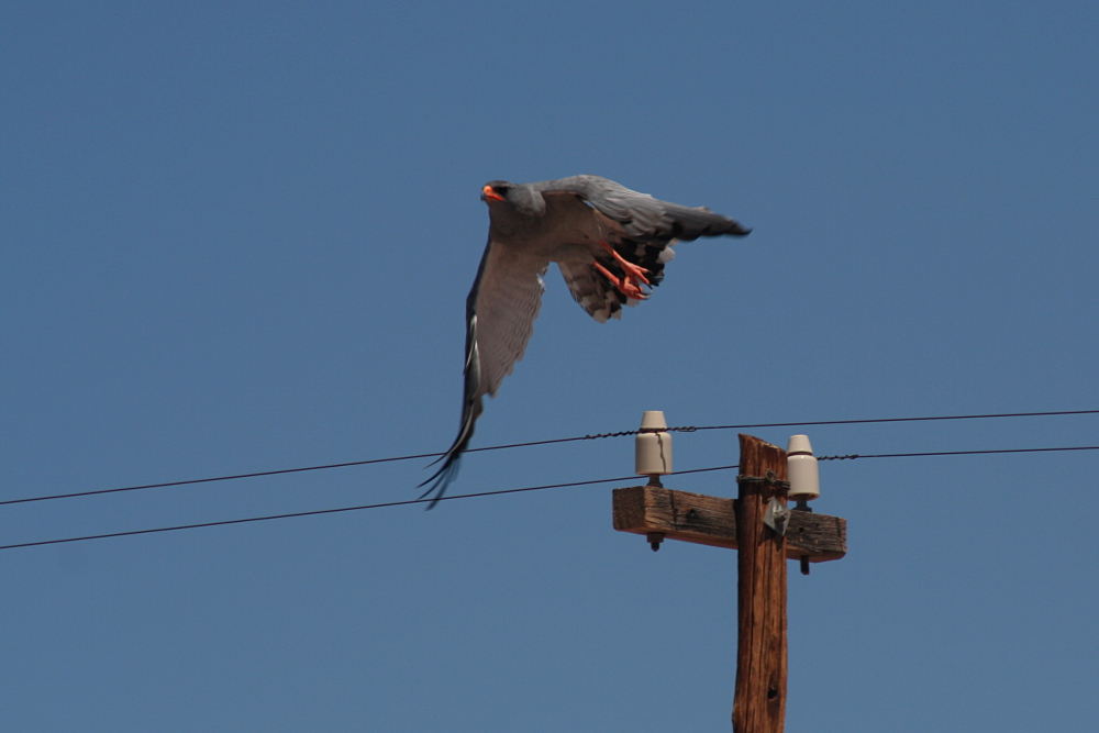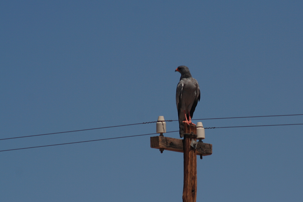 The Pale Chanting Goshawk (Melierax canorus) is a medium-sized bird of prey occurring in southern Africa. In this region, the birds favor dry and open habitats preying on lizards, birds, small mammals, and larger insects. During a journey through the countryside, they can be seen quite commonly perching on telephone poles. I have photographed these raptors during a journey through northern Namibia in February 2007.
