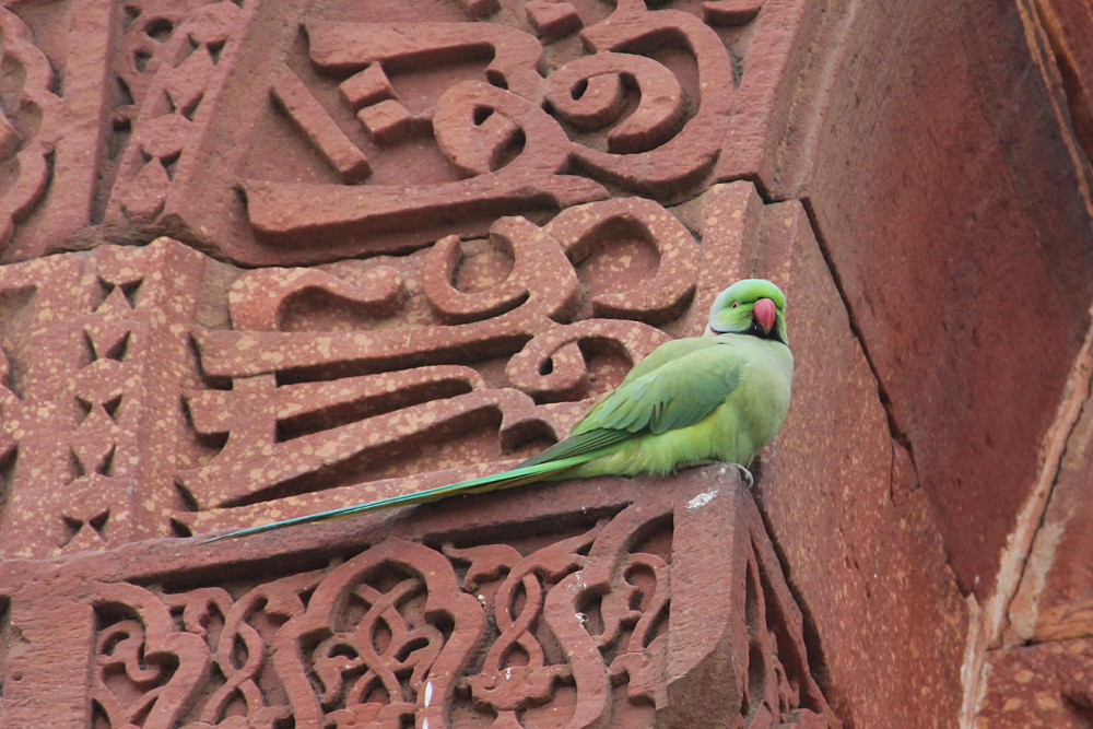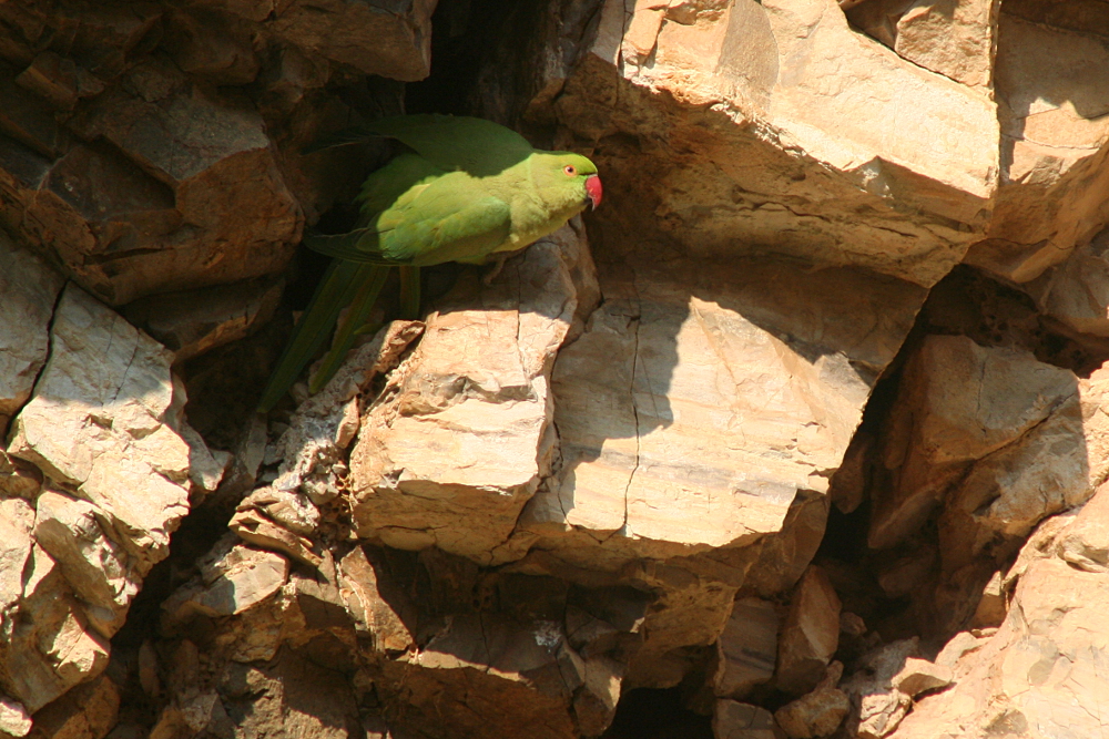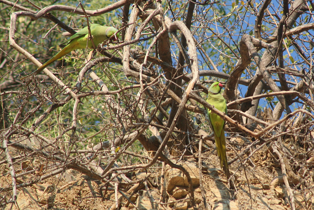 The Rose-ringed Parakeet (Psittacula krameri) is a medium-sized bird originally occurring in South Asia (India, Pakistan, Bangladesh, Myanmar) and throughout the Sahel of Africa (from Guinea and Senegal up to Somalia). The birds are gregarious and herbivorous feeding mostly on buds, fruits, vegetables, nuts, berries, and seeds. Although they share a shining green plumage, sexes can be distinguished by the reddish ring around the neck only carried by males. The birds agree well with humans and are often seen within city limits, for example, in parks and gardens or around monuments. The Rose-ringed Parakeet has been a popular pet species for a long time – starting already with the ancient Greeks and Romans who are known to have kept these birds. Certainly, this is partly caused by their ability to mimic human speech. Due to the escape of such pets, the species became introduced to many more regions, including a number of European cities, the US, northern and southern Africa, the Middle East, and Japan. During journeys through India, the pretty birds are a common sight. I have photographed them in Kachchh (December 2008), Hampi (September 2011), and Delhi (January 2014).