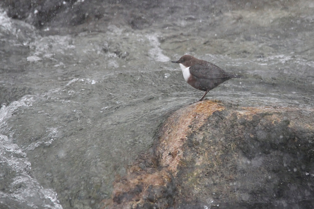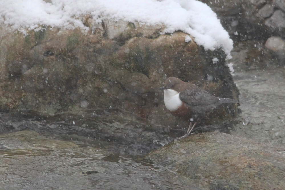 The White-throated Dipper (Cinclus cinclus) is a starling-sized bird occurring in much of Europe, northern Africa, the Middle East, Central Asia (up to China), and northern India. Generally, the birds are found along fast running rivers and streams. They swim, dive, and walk underwater in search for prey including aquatic insects, molluscs, crustaceans, and worms. They fly fast and straight while following the river course and stay relatively close to the water’s surface. I have seen these fascinating birds on a number of walks in Germany. The photographs in this post are from a trip to Berchtesgaden in southern Germany in December 2014. Snow was falling and nonetheless the small dipper was diving in the ice-cold water of the mountain stream – I felt much better in my winter jacket.