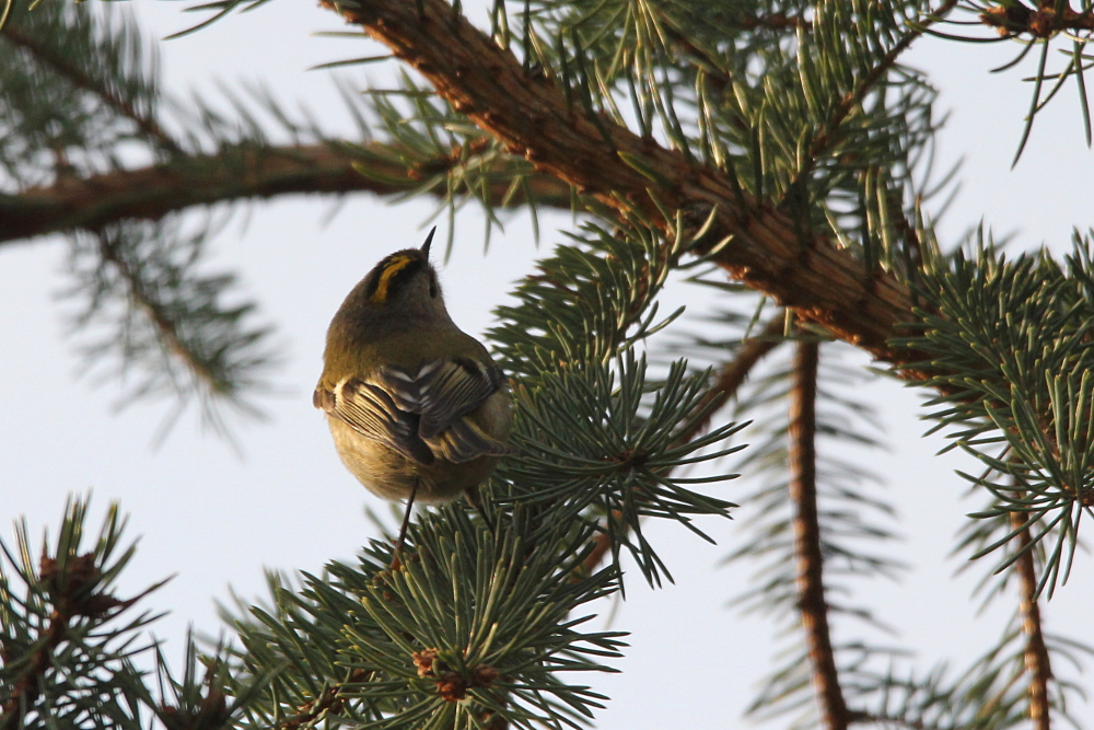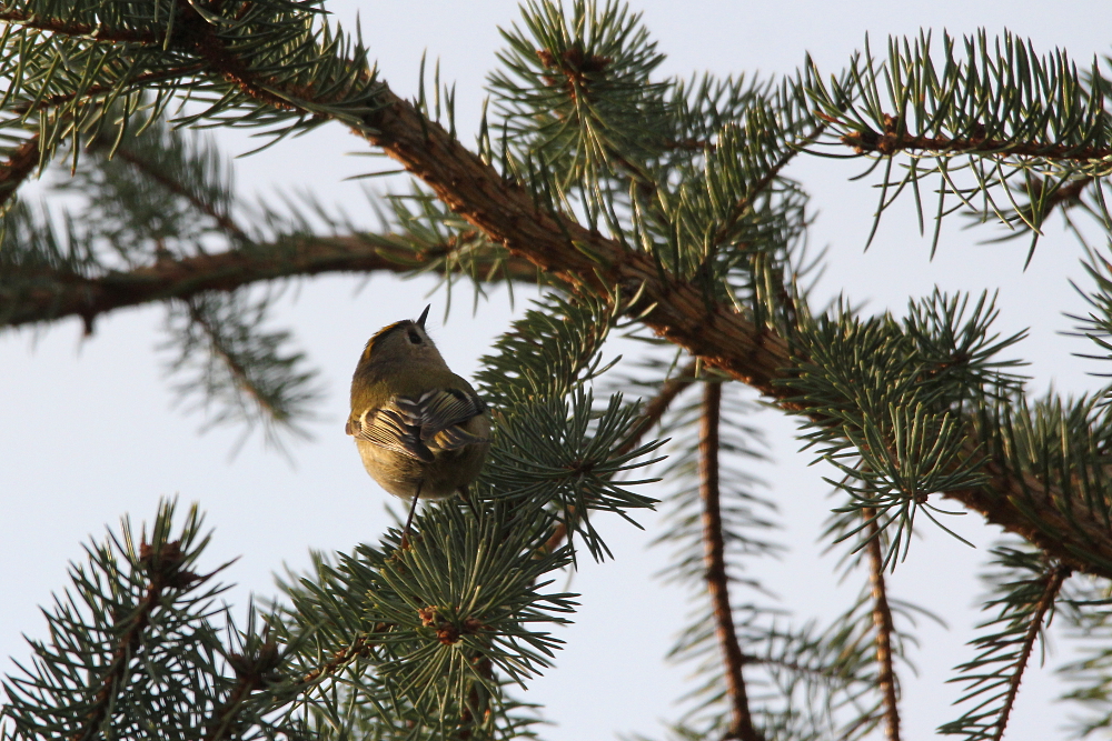 With a body length of around 9 cm and a weight between 4 and 7 grams, the Goldcrest (Regulus regulus) is the smallest bird of Europe! Having said that, the closely-related Common Firecrest (Regulus ignicapilla) is also that small and they actually share the honour. Both species look similar, but the firecrest has a black stripe across the eye which is lacking in the present species. Goldcrests occur in most parts of Europe as well as in a belt through Asia up to Japan. Within this range, they are closely linked to coniferous forests as their habitats. Their nests are also built in conifers, but consist of the silk of cocoons from spiders and caterpillars. This way, the nests are so well isolated that the parents can leave their eggs alone for a long time even during cold days. The little birds feed almost exclusively on small arthropods (insects etc.) found mostly on the underside of twigs. Each day they take up at least as much as their own body weight! Characteristic is a common hopping and flittering among the branches – unfortunately making photography not easier… I have taken the photographs in this post during April 2015 in northern Germany. For a closer look, you can click on the pictures (as always).