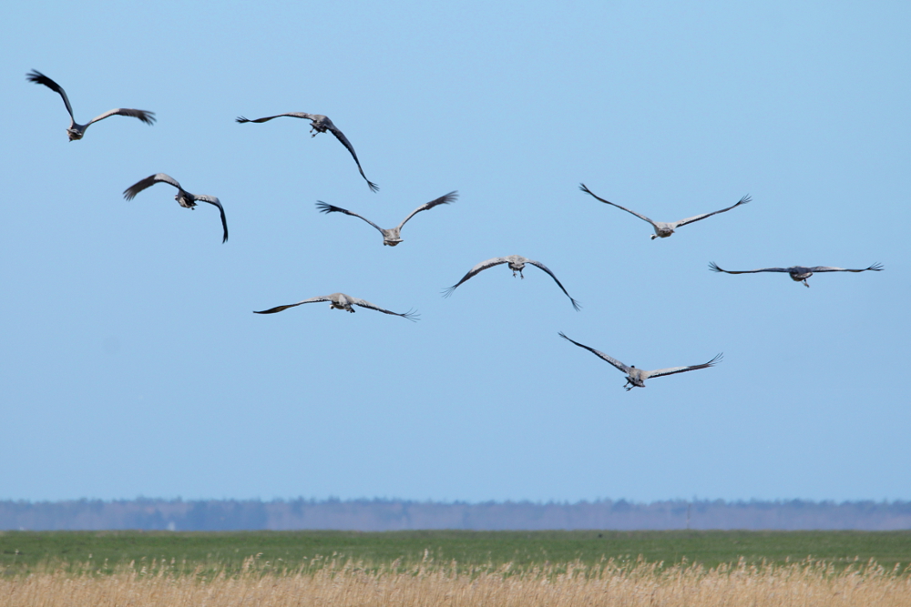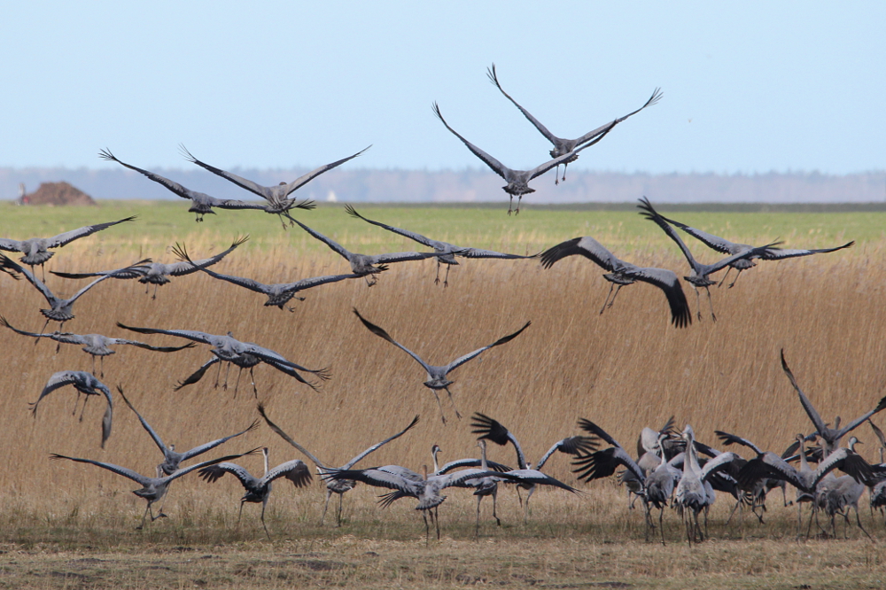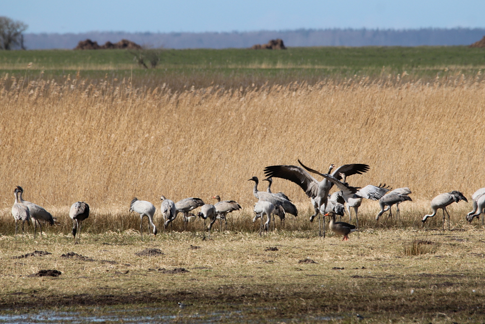 The Common Crane (Grus grus) is a large bird breeding in northern Europe and Asia, while migrating south towards northern Africa, Arabia, India, and China for the winter months. The birds breed mostly in boreal or taiga forests, mixed forests, moors, or swamps. Their diet is very diverse and includes plant matter (for example roots, seeds, fruits, and leaves) as well as other animals (e.g., insects, snails, spiders, crabs, amphibians, small rodents, and even young birds). The cranes live in monogamous pairs, but still a courtship ritual is started anew with each breeding season. This dancing of the cranes is fascinating humans since many centuries and gained them an important place in the mythology of many cultures. Among other things, they are considered to be a symbol of luck, long life, vigilance, and wisdom.This fame led to a common depiction of cranes in fables, fairy tales, paintings, and other forms of art.