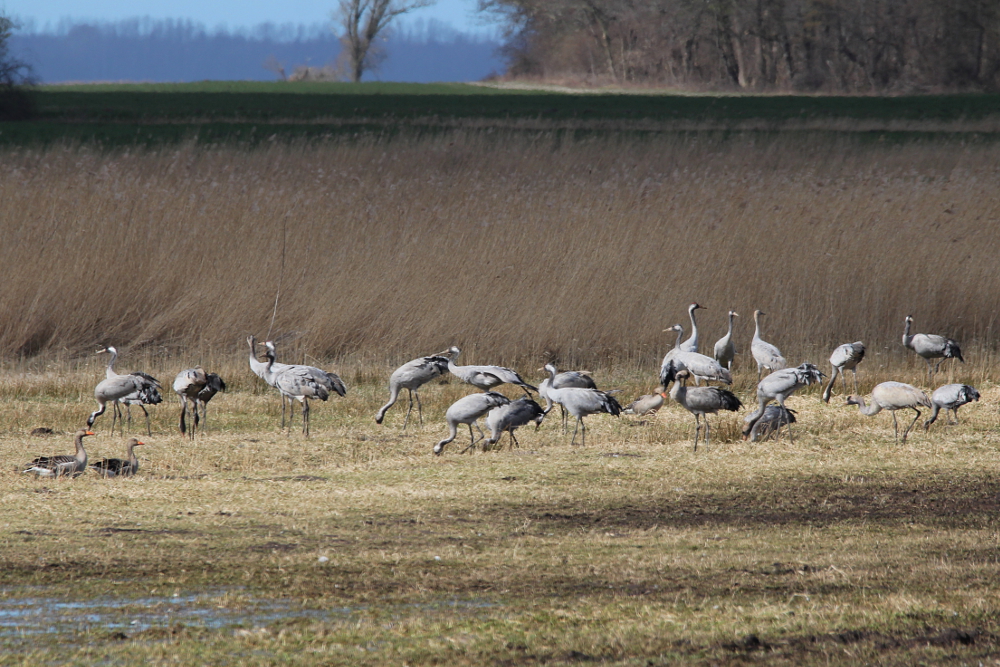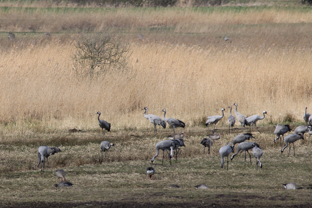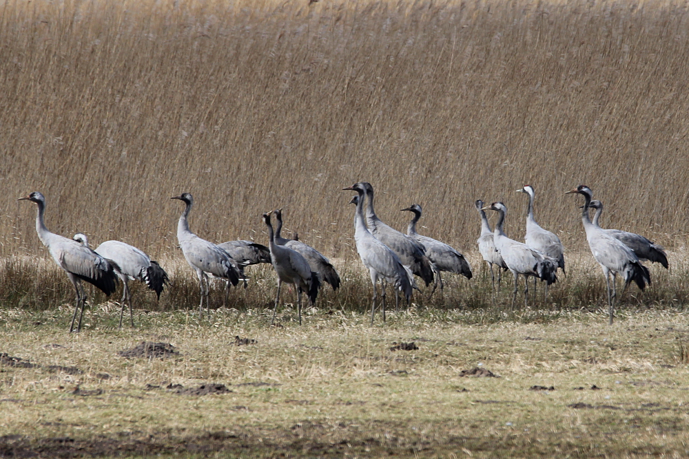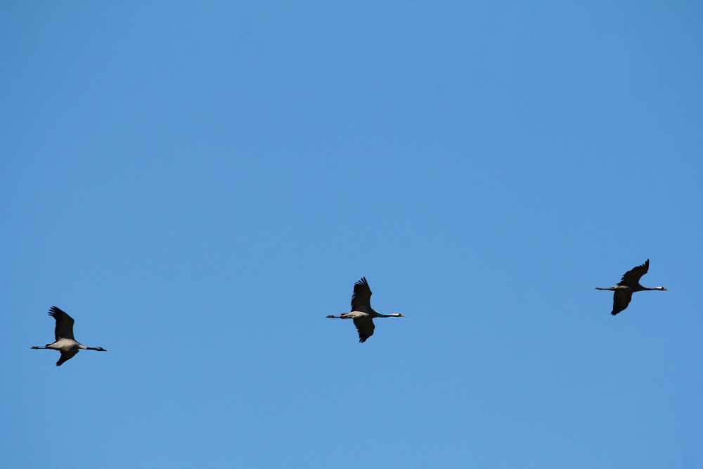 During the migration, the birds are very social and often occur in large groups of several hundred individuals. After their arrival in the breeding area, however, they disperse and the pairs become rather secretive. During this time, they are also quite sensitive to disturbances by humans. The most important threat to cranes in Europe was a loss of suitable habitats, but strong protection measures led to a steady increase in the populations and overall the species is not threatened. I have photographed these majestic birds in northern Germany (April 2015), where they traditionally take a break from their migration in spring and autumn. Only the last photograph in this post is from western India in January 2014.