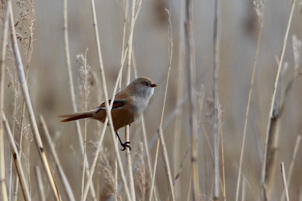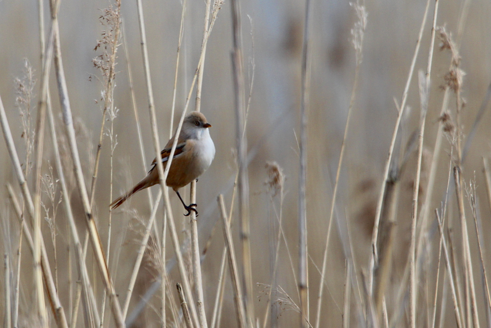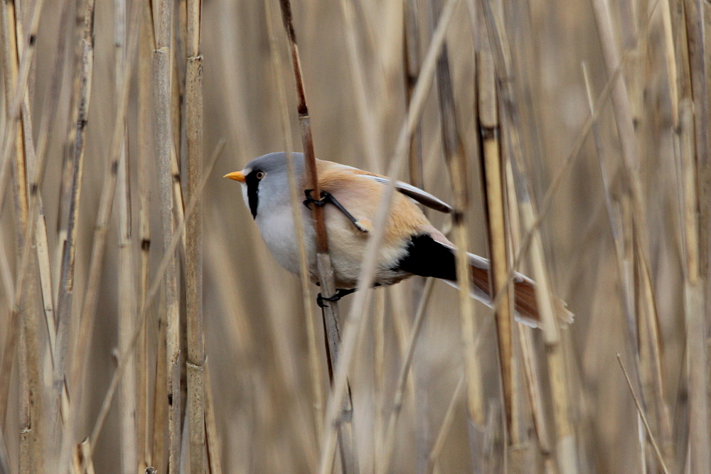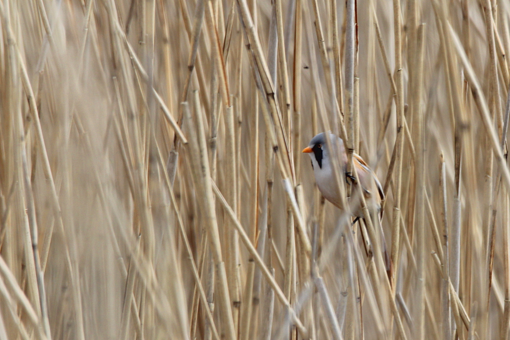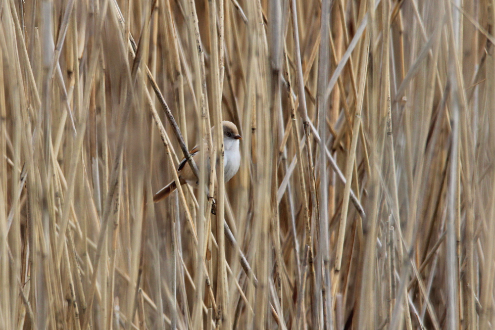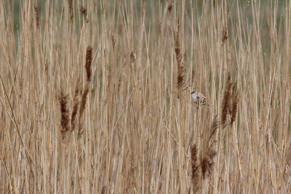 The Bearded Reedling (Panurus biarmicus) is a small, long-tailed bird occurring in temperate Europe and Asia. The species inhabits wetland, more specifically extensive reed zones. Most of the time, the birds jump around in-between canes looking for seeds in winter and insects as well as spiders in summer months. Both sexes can be easily differentiated by their plumage: while the males sport fancy black moustaches at each side of the orange bill, the females are much duller (see photographs below). Pairs form already as juveniles and become inseparable for life – how romantic!! I knew the species only through my guide book, but last weekend (May 2015) I happened to spot a flock of these extremely pretty birds at the coast of the Baltic Sea in northern Germany. I felt very lucky, because the individuals were not easy to see among the reeds! Nevertheless, the Bearded Reedling might not be as rare as I imagined and actually occurs in Germany with a few thousand pairs in suitable habitats. However, the species experiences drastic fluctuations in numbers with stark decreases during harsh winters. Fortunately, winter is NOT coming right now! 😉