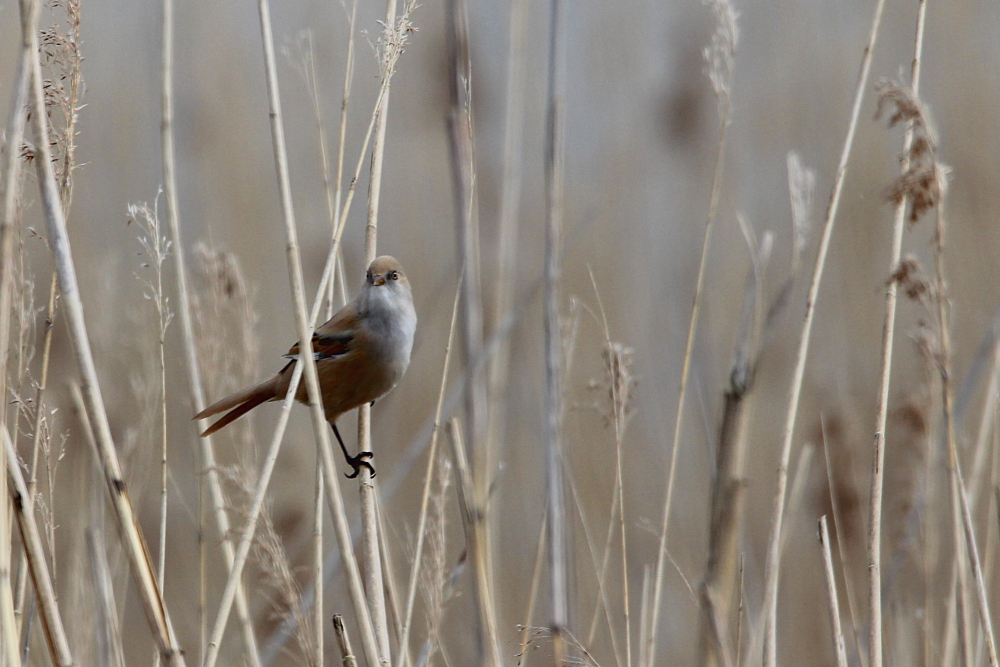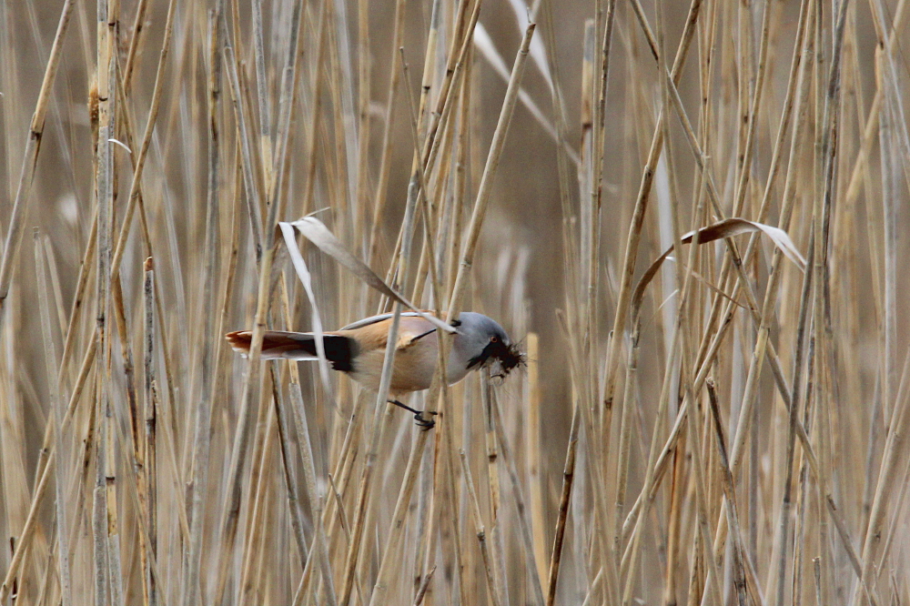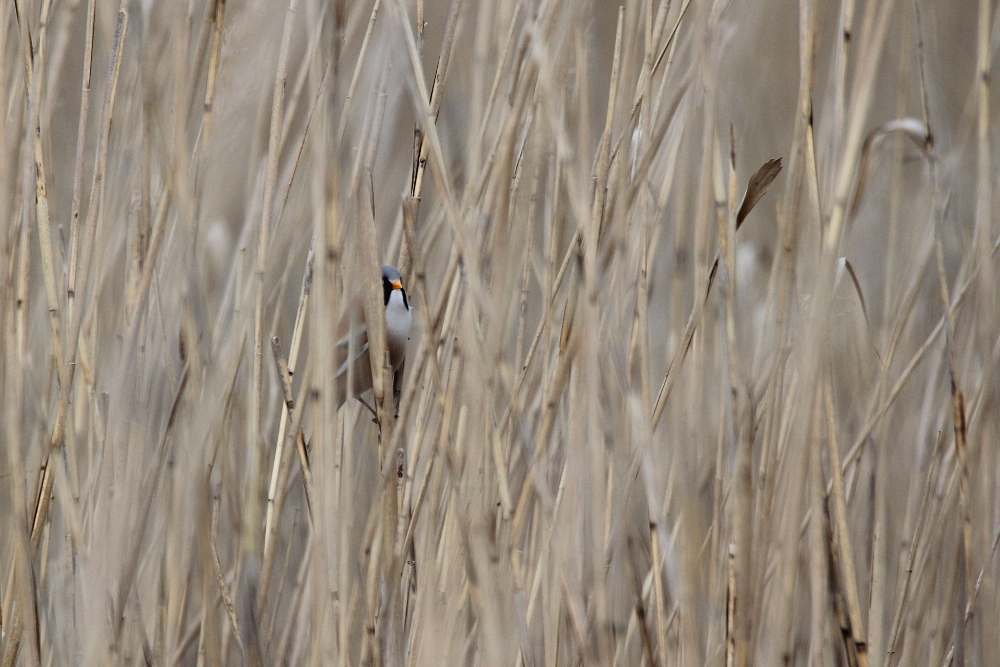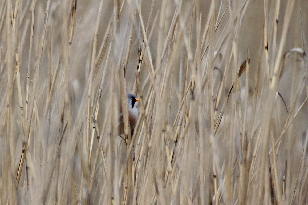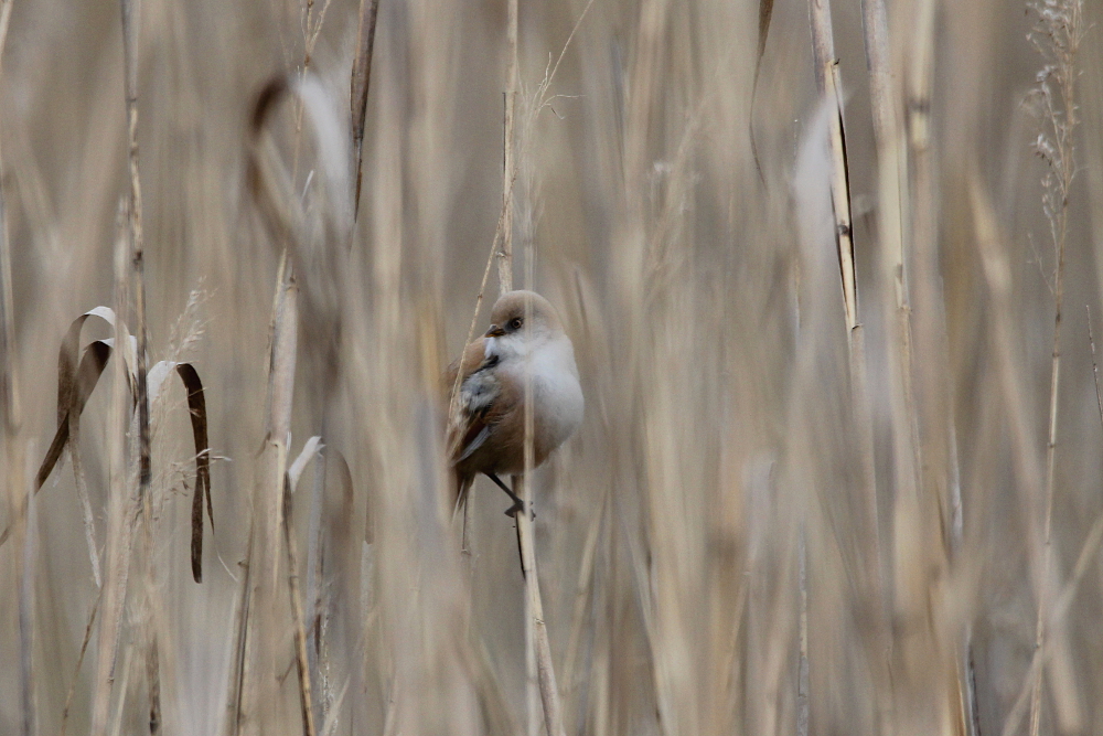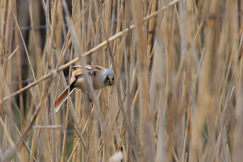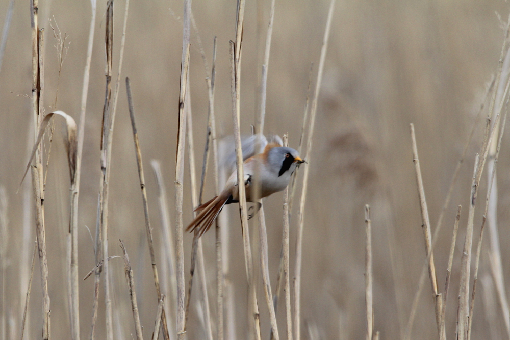 The Bearded Reedling (Panurus biarmicus) is a small, long-tailed bird occurring in temperate Europe and Asia. The species inhabits wetland, more specifically extensive reed zones. Most of the time, the birds jump around in-between canes looking for seeds in winter and insects as well as spiders in summer months. Both sexes can be easily differentiated by their plumage: while the males sport fancy black moustaches at each side of the orange bill, the females are much duller (see photographs below). Pairs form already as juveniles and become inseparable for life – how romantic!! I knew the species only through my guide book, but last weekend (May 2015) I happened to spot a flock of these extremely pretty birds at the coast of the Baltic Sea in northern Germany. I felt very lucky, because the individuals were not easy to see among the reeds! Nevertheless, the Bearded Reedling might not be as rare as I imagined and actually occurs in Germany with a few thousand pairs in suitable habitats. However, the species experiences drastic fluctuations in numbers with stark decreases during harsh winters. Fortunately, winter is NOT coming right now! 😉