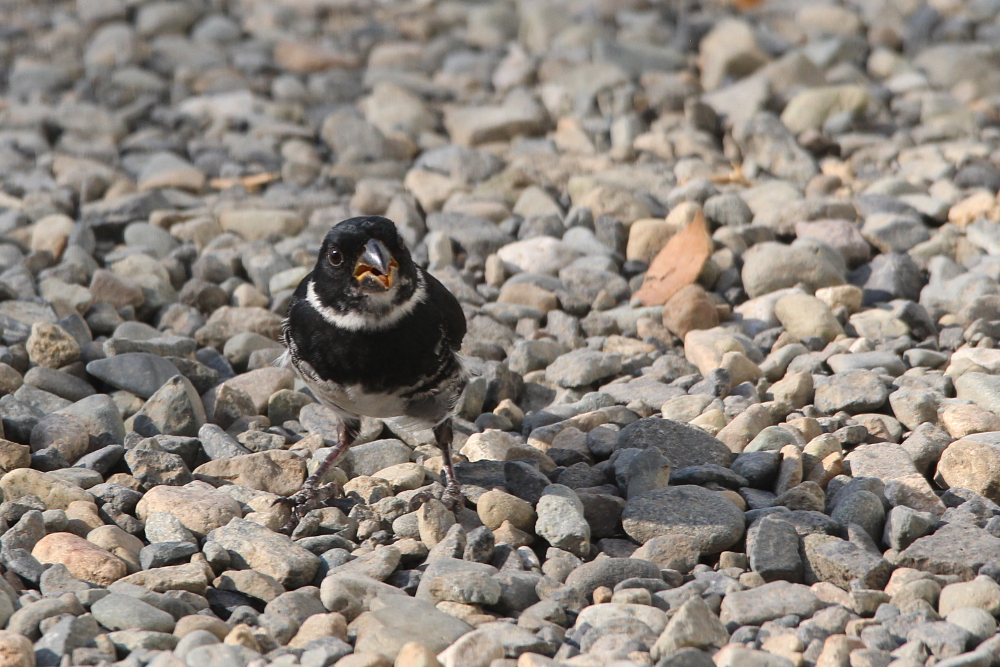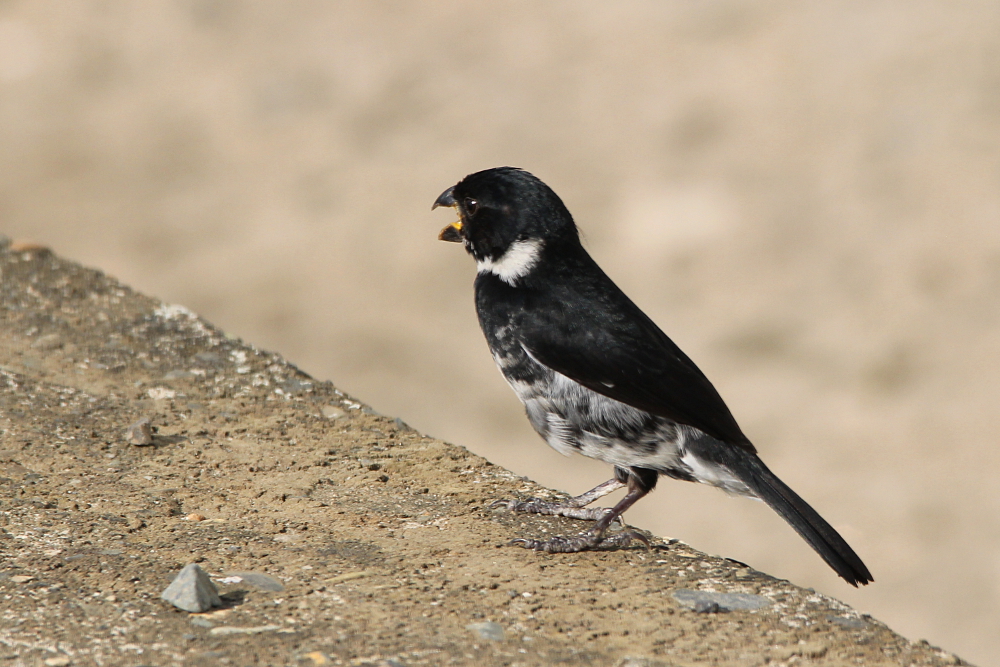 The Variable Seedeater (Sporophila corvina) is a small passerine bird occurring from southern Mexico through Central America up to northwestern South America (including parts of Colombia, Ecuador, and northern Peru). The taxonomy of this species is highly complicated due to comparatively large variations in plumage. Sometimes, it is merged with the Wing-barred Seedeater (Sporophila americana) and discussions on the status of a number of subspecies are still on-going. I photographed the birds on the Pacific side of Panama (on Naos Island near Panama City), where the males have a grey to whitish rump and a white collar, but along the nearby coast of the Caribbean, they are almost entirely black! Females are in general olive-brown and show less variation. The birds are relatively common in semi-open areas such as forest edges or clearings, gardens, and parks. True to their name, they feed mostly on seeds, but also take the occasional flower, bud, berry or insect.