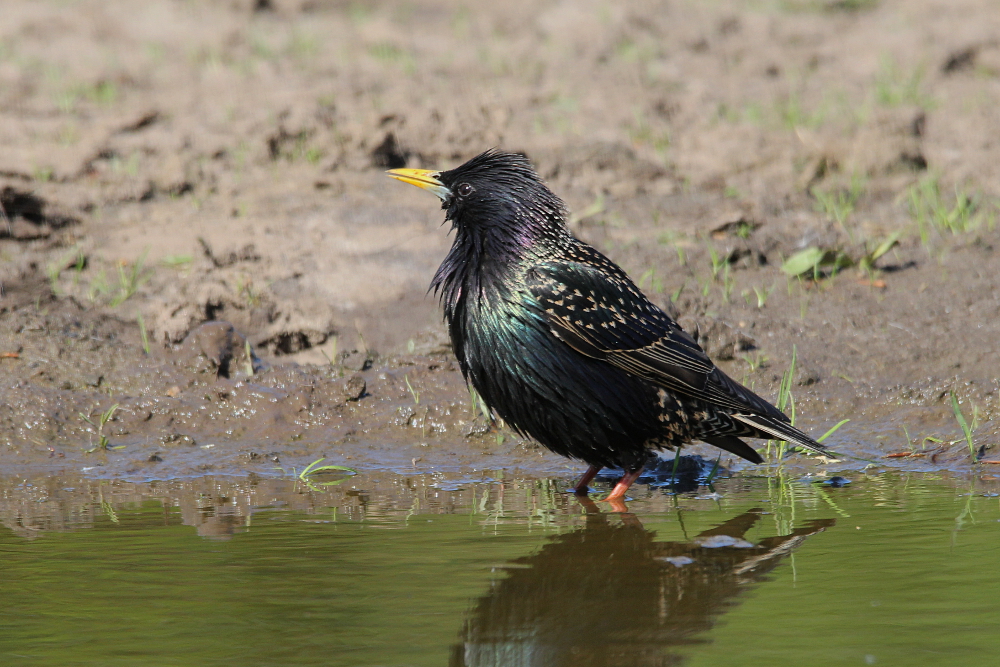 The Common or European Starling (Sturnus vulgaris) is a medium-sized bird native to Europe, northern Africa, and western Asia. In addition, the species has been introduced to Australia, New Zealand, southern Africa, northern America, and parts of southern America. The birds are omnivorous, feeding on insects, worms, and other invertebrates as well as seeds and fruits. Occasionally, very large flocks of several thousand individuals gather and can become a considerable nuisance in towns due to their noise and droppings. Similarly, they can cause substantial damages in fruit plantations. The flocks fly in dense clouds commonly changing shape against the sky, a behaviour believed to protect individuals against birds of prey. In Europe, the Common Starling is one of the most abundant birds and recently I have photographed these pretty birds with their iridescent, glossy black plumage at several places in northern Germany (April and May 2015).