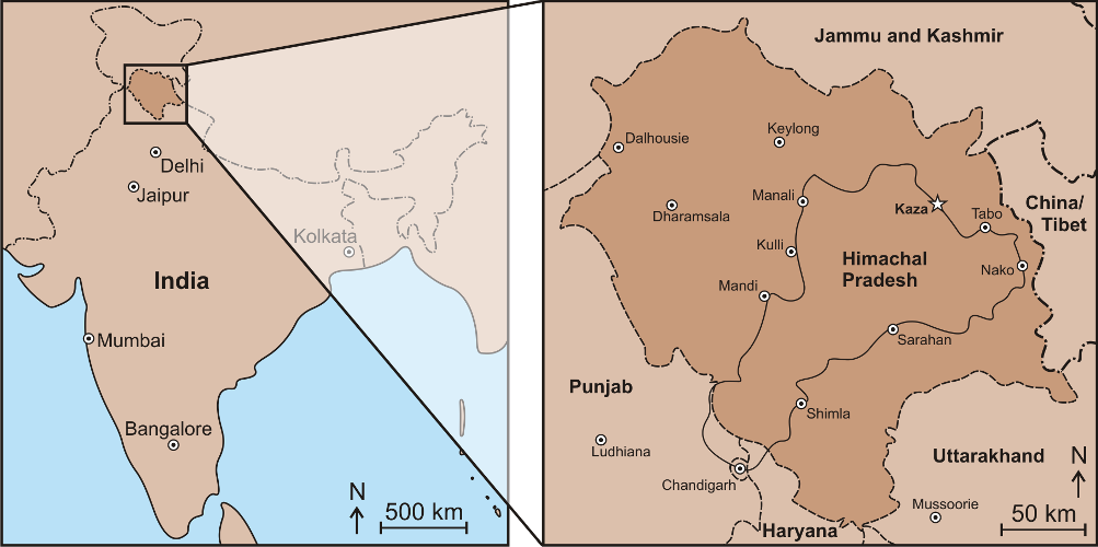 While Kaza lies at an altitude of ca. 3600 m, our research brought us to the high plateau east of the valley at altitudes between 4200 and 4500 m. The landscape surrounding the tiny villages of Chichim, Kibber, Gete, Tashigong, Langza, Hikkim, Komic, and Demul was really unbelievable. The clear sky, bright sun, snow-clad mountains, and rugged scenery were just fantastic. Apart from work, we could also visit the interesting Kye and Tangyud monasteries. Just click through the gallery, to get an idea of the magnificence of the Spiti Valley.