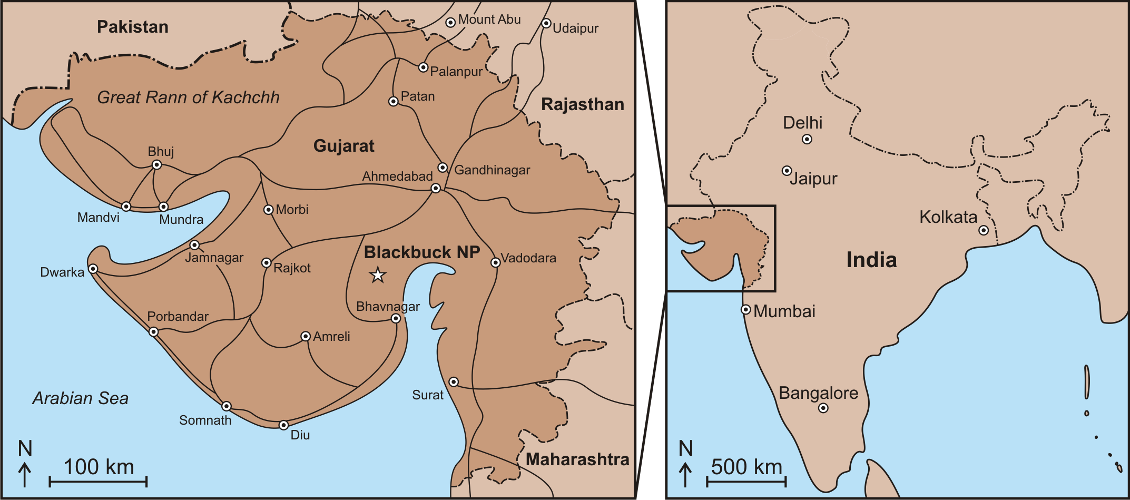 The Blackbuck National Park near Bhavnagar is a protected patch of grassland inhabited by large numbers of antelopes. Apart from Blackbucks, you can expect to see Nilgai and several bird species. During the winter months, the area is also an important harrier roost (especially Pallid Harriers). Furthermore, the park is famous for its wolves and hyenas, but unfortunately I was not lucky enough to spot these elusive carnivores.