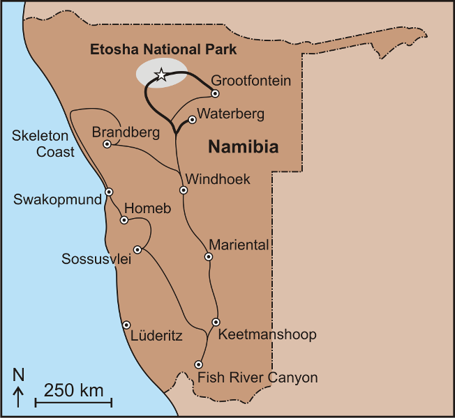 Covering an impressive 22,270 km², the Etosha National Park is Namibia’s most important nature reserve. Since its establishment in 1907, the park protects the magnificent flora and fauna of northern Namibia – including such characteristic species as the African Elephant, Black and White Rhinoceros, African Buffalo, Giraffe, Lion, Leopard, Cheetah, Black-backed Jackal, Spotted Hyena, Burchell’s Zebra, Springbok, Black-faced Impala, Gemsbok, Red Hartebeest, Blue Wildebeest, Damara Dik-dik, Greater Kudu, and Common Eland. Luckily, we were able to see most of these mammals as well as a good number of birds. Highlights included lions at a zebra kill, mating lions, drinking giraffes, and large numbers of elephants and rhinos coming to the illuminated waterholes at the rest camps at night. I wish I had a better camera and lens back then – but I think the gallery will still give you a good idea of the abundance of wildlife…